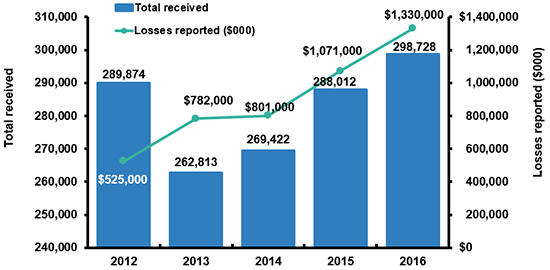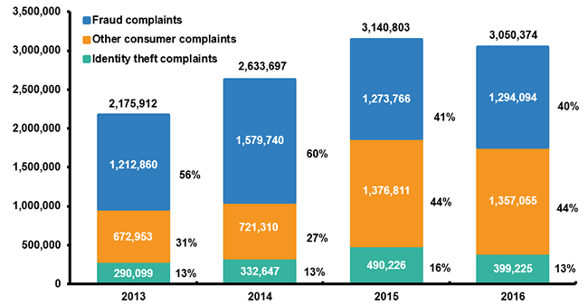 The Consumer Sentinel Network, maintained by the Federal Trade Commission (FTC), tracks consumer fraud and identity theft complaints that have been filed with federal, state and local law enforcement agencies and private organizations. Of the 3.1 million complaints received in 2016, 1.3 million were fraud-related, costing consumers over $744 million. The median amount consumers paid in these cases was $450. Within the fraud category, debt collection complaints were the most reported and ranked first among all 30 types of complaints identified by the FTC. They accounted for 28 percent of all the complaints reported to the FTC and 66 percent of all fraud complaints. In 2016 thirteen percent of all complaints were related to identity theft. Identity theft complaints were the third most reported to the FTC and had increased by more than 47 percent from 2013 to 2015 but fell about 19 percent from 2015 to 2016.